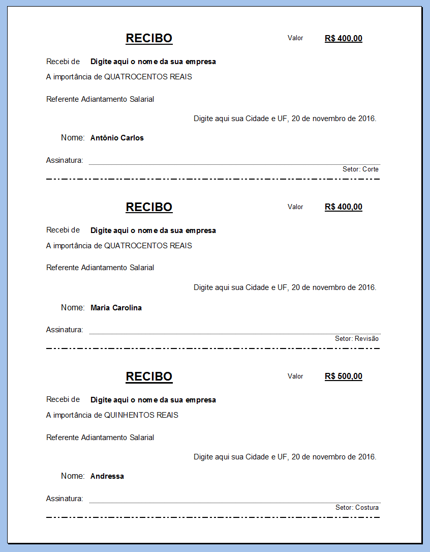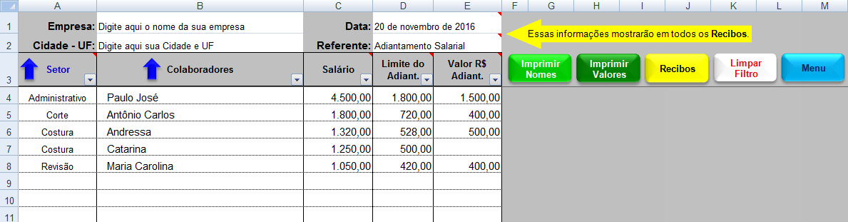 - Esta Planilha em Excel contém macros e tem como objetivo facilitar o pessoal do RH para ter uma lista mensal para controle do Adiantamento Salarial de todos os Colaboradores da Empresa, com opção para impressão dos Recibos.
