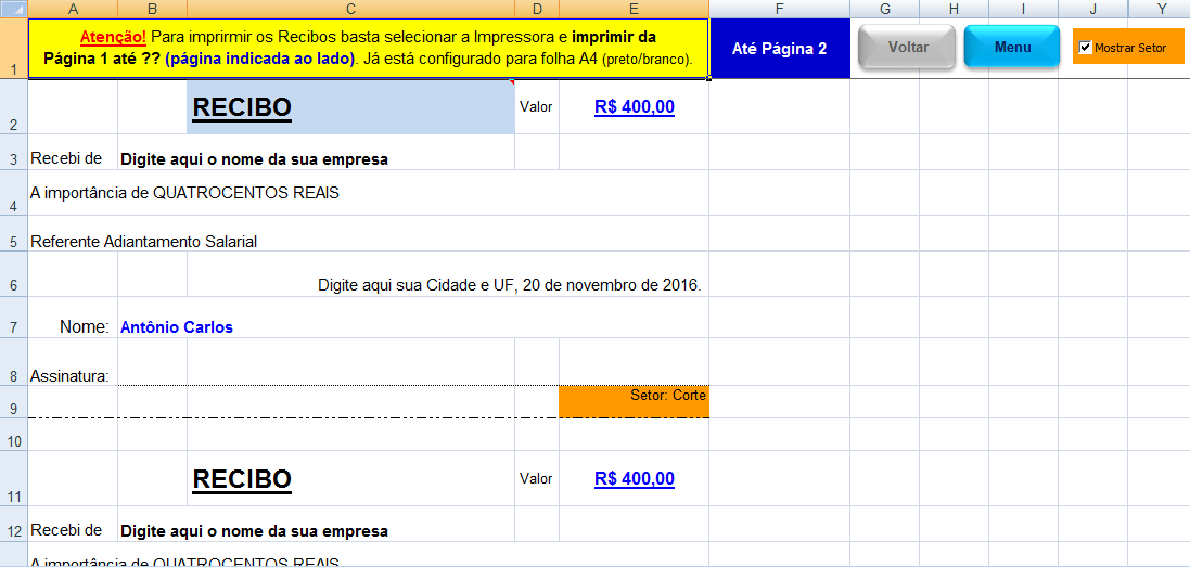 IMPRESSÃO DOS RECIBOS: Impressão da primeira página dos Recibos acima.