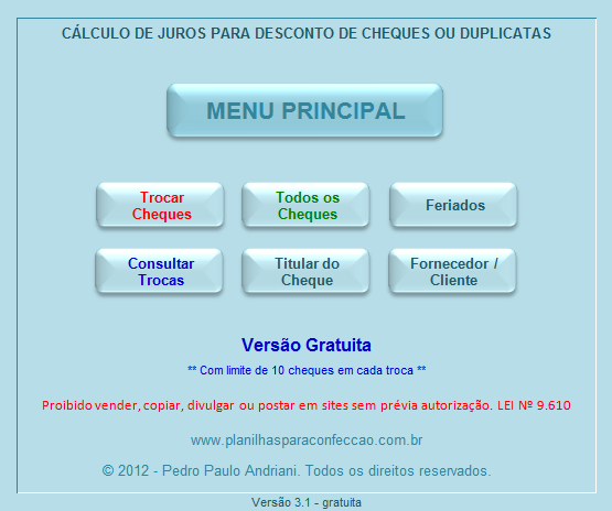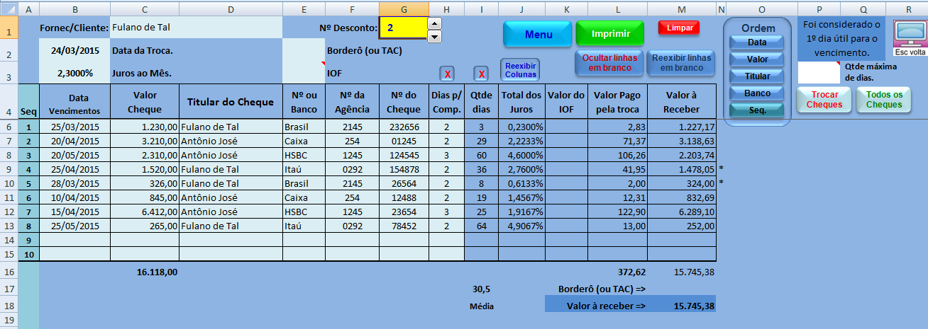 - Planilha em Excel com macros que deixa automatizada, para cálculo de juros para desconto de Cheques ou Duplicatas. Esta planilha facilita o controle financeiro, pois mostra percentual e valor exato de cada cheque ou duplicata que fizer desconto.