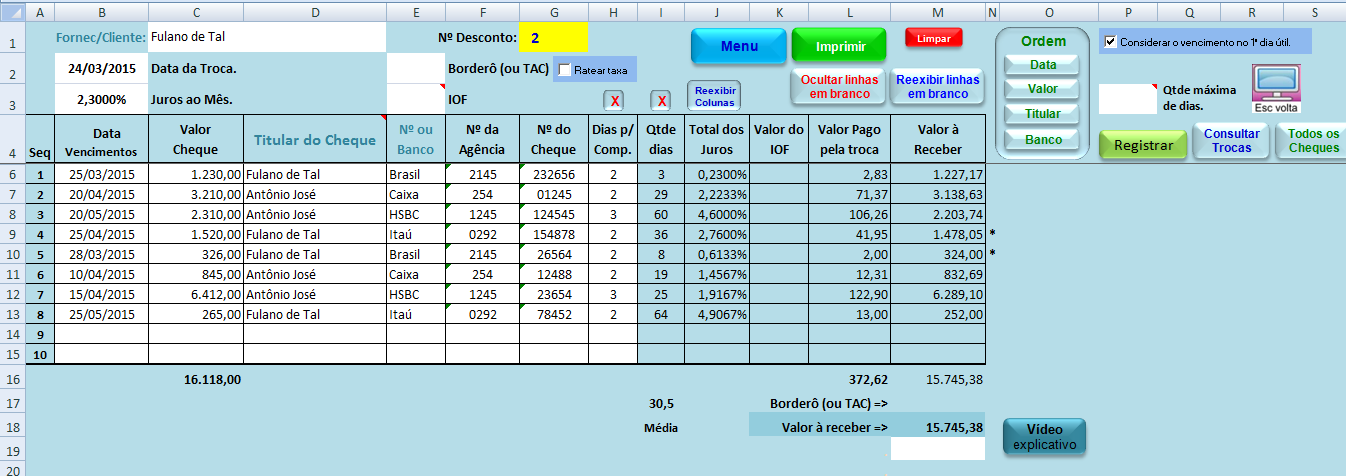 TROCA DE CHEQUES OU DUPLICATAS: Digite aqui as informações necessárias (até 10 folhas de cheque) que automaticamente mostrará os valores referentes a esta troca. Antes de Registrar esta troca, caso você desejar, poderá colocar em ordem de: Data, Valor, Titular ou Banco.