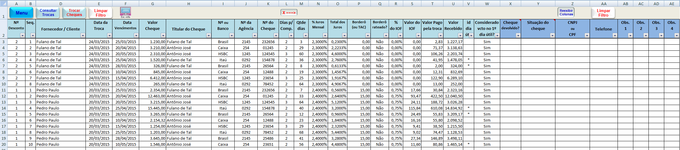 - Você cria automaticamente um banco de dados com todas as trocas realizadas, onde poderá fazer vários tipos de análises dos seus cheques ou duplicatas em questão de segundos, através do filtro do Excel.