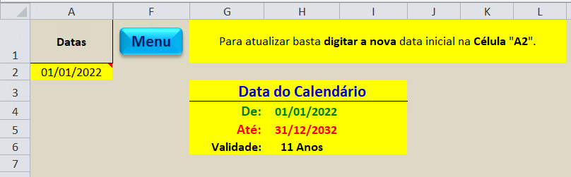 DATA DO CALENDÁRIO: Aqui você atualiza o calendário bastando digitar a data início, automaticamente terá 11 anos para frente a partir da data informada (conforme imagem abaixo).