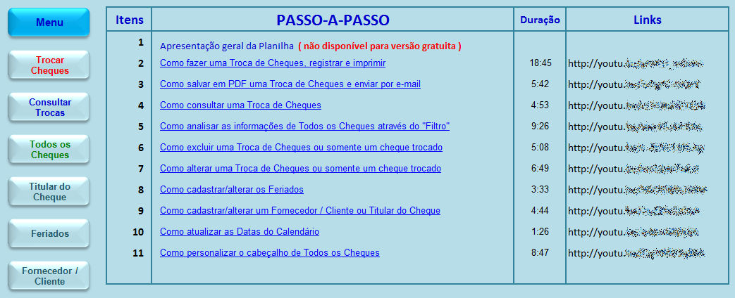 PASSO-A-PASSO: Esta é a tela do passo-a-passo que está incluído na Planilha, são 10 vídeos (o item 1 não está disponível para versão gratuita) que explicam detalhadamente cada item para que você entenda e utilize a Planilha corretamente. Os vídeos estão postados no YouTube, é só clicar na descrição dos itens e você será direcionado para o vídeo. Se preferir poderá copiar o link e colar no seu navegador para ver o vídeo.