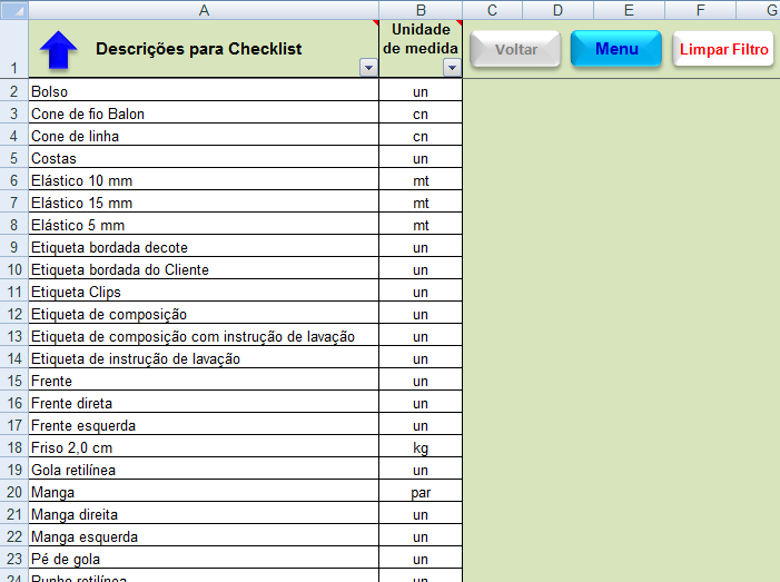 Planilha em Excel com macros que deixa automatizada, para fazer uma Checklist dos insumos utilizados num determinado produto.