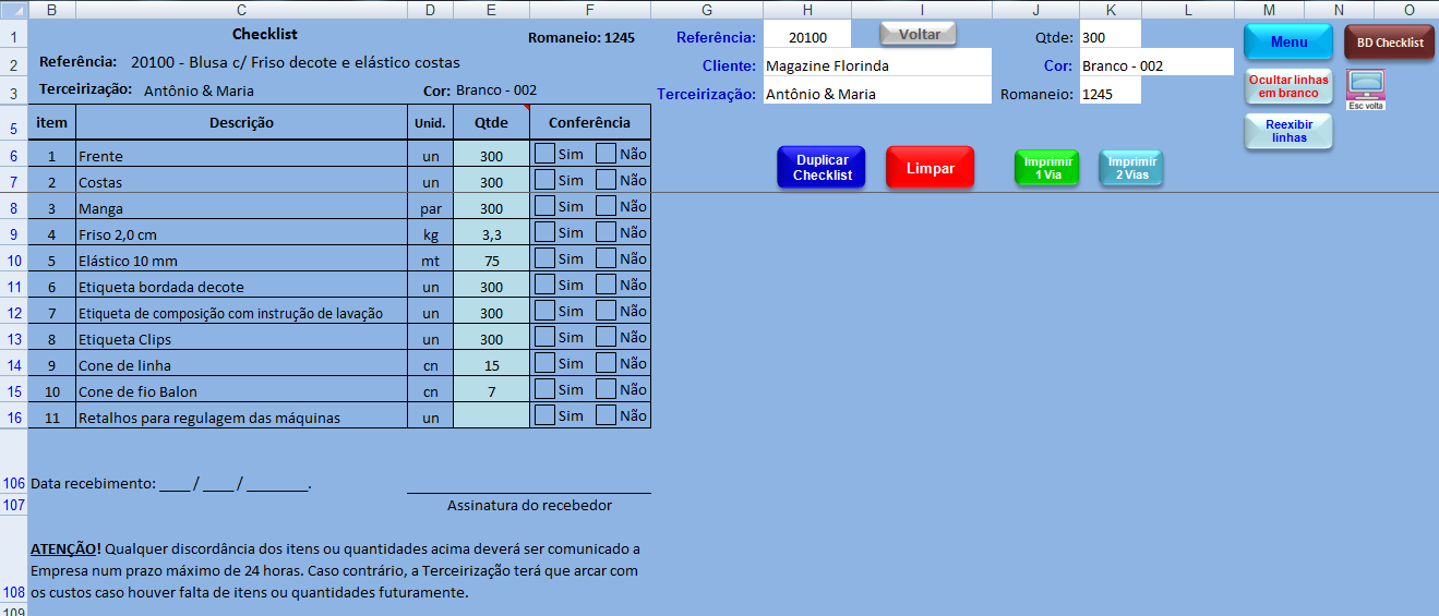 EXEMPLO DE CONSULTA E IMPRESSÃO DE CHECKLIST: Neste exemplo com a mesma Referência acima e com a quantidade de 300 peças repare que mostra a quantidade necessária de cada item da Checklist. Nos itens 9, 10 e 11 que acima estavam sem quantidades aqui foram digitadas nos itens 9 e 10 as quantidades necessárias e no item 11 foi deixado sem valor por não ter uma quantidade definida, mas mostra na Checklist para não ser esquecido.