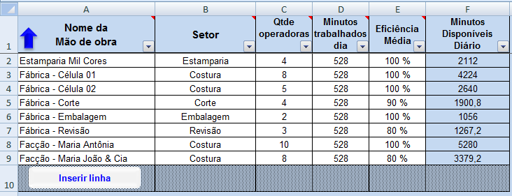CADASTRO DA MÃO DE OBRA DIRETA: Aqui você cadastra toda a sua Mão de obra disponível, seja ela dentro da empresa ou terceirizada. Esta é a sua capacidade produtiva diária em minutos, qualquer alteração aqui muda automaticamente o abastecimento, portanto é necessário manter sempre atualizado.