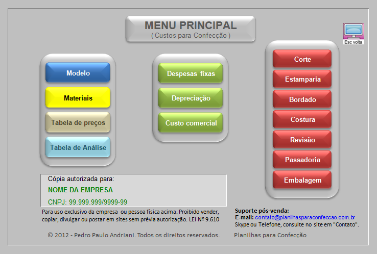 Atenção! A compra da Planilha não dá direito a repassar cópias a ninguém. No Menu da planilha identifica a “empresa” ou “pessoa física” que está autorizada o uso da planilha. Proibido vender, copiar, divulgar ou postar em sites sem prévia autorização. LEI Nº 9.610.