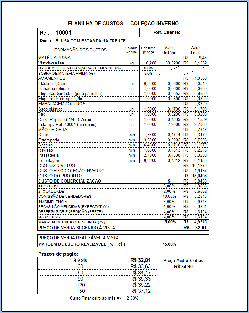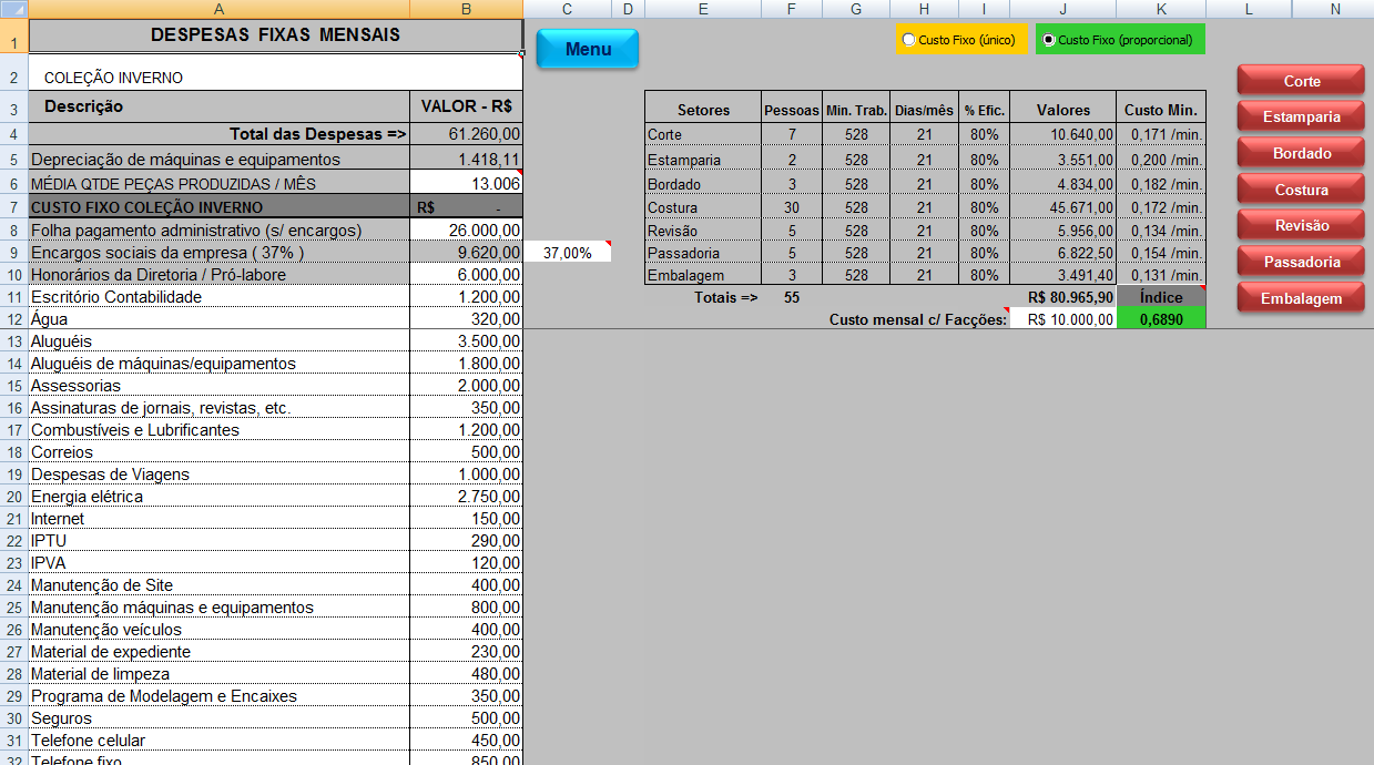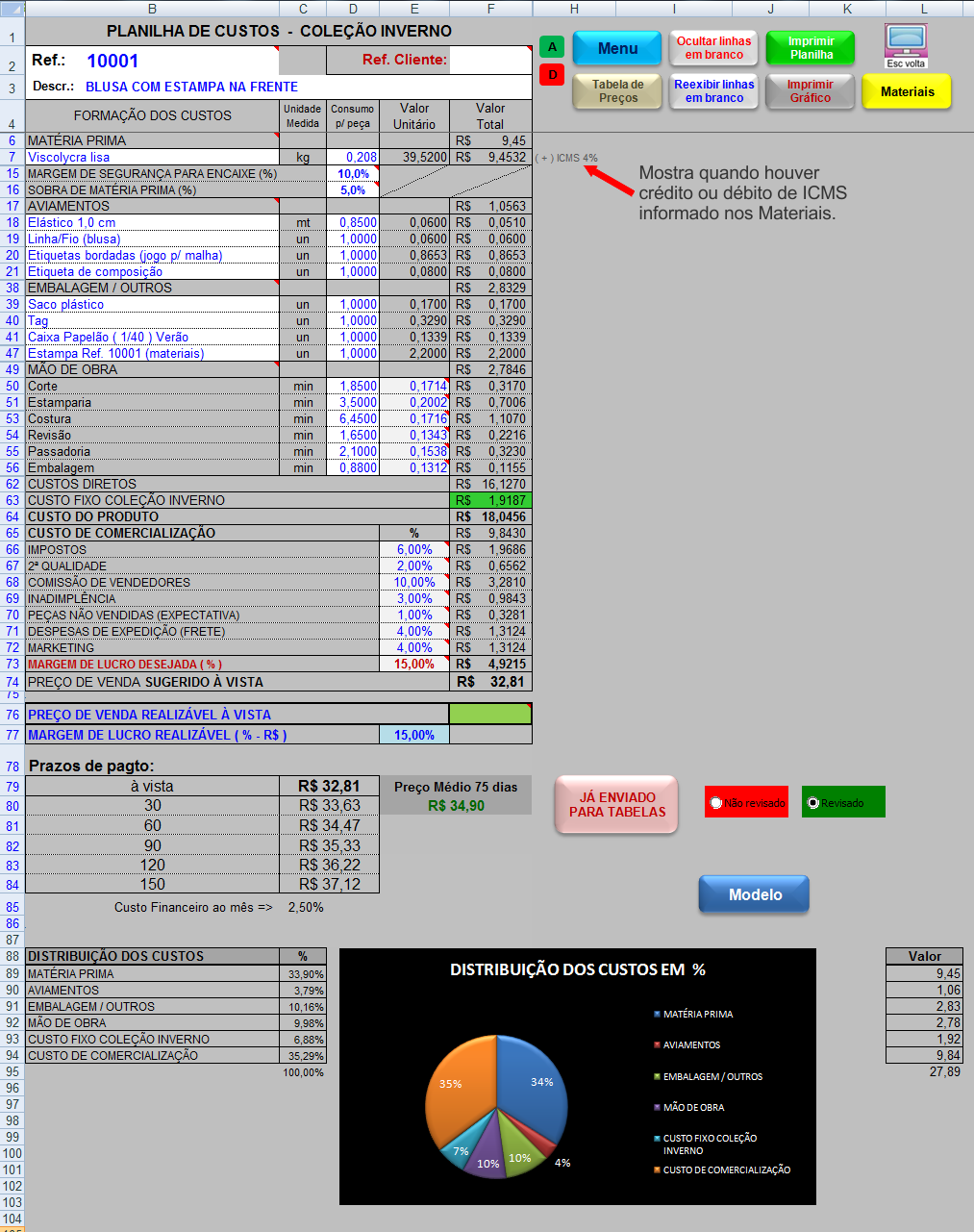 Planilha em Excel com macros que deixam automatizada, desenvolvida por Pedro Paulo Andriani (Pepe), Técnico Têxtil formado pelo CETIQT (Rio de Janeiro - RJ) em julho/1984. Com experiência de 28 anos no ramo de Confecção desenvolvi esta planilha para formação dos custos.