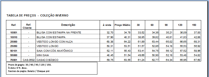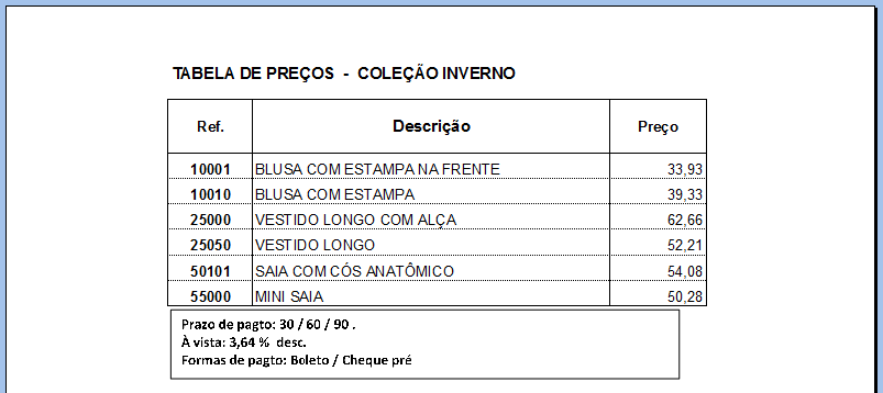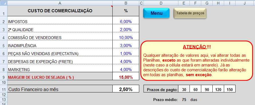 Qualquer alteração de valores ou índices nas planilhas de custos ou nos percentuais de comercialização, altera automaticamente esta tabela. Está configurada para impressão preto e branco em folha A4 (da coluna A até J e até a última linha amarela). A impressão das colunas com preços você escolhe qual imprimir, para tanto, basta ocultá-las ou mostrá-las, clicando nos respectivos botões. As descrições da "linha 3", colunas "D" e "E", poderão ser alteradas conforme sua necessidade.