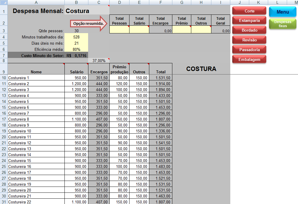 DESPESA MENSAL DO SETOR (a Confecção que não tem o setor porque só terceiriza, basta ignorar):