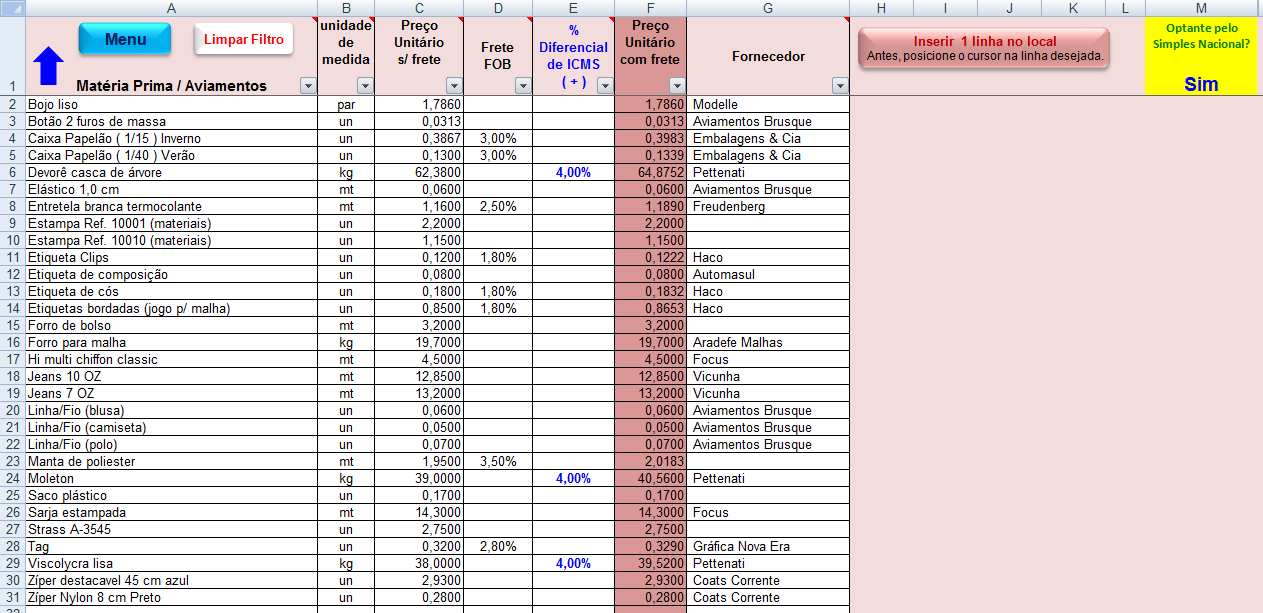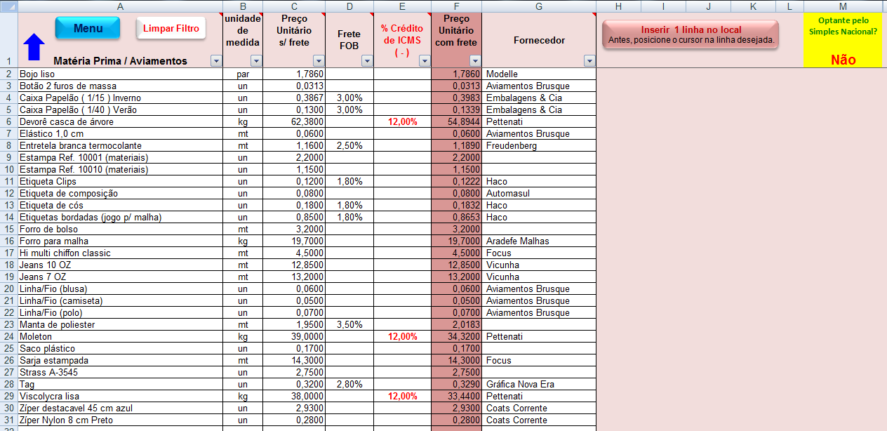 Aqui são cadastrados todos os insumos que serão utilizados para composição dos custos. Quando houver Crédito de ICMS em algum produto, informe na “coluna E”, o preço unitário com frete (coluna F) será atualizado com o desconto deste percentual.
