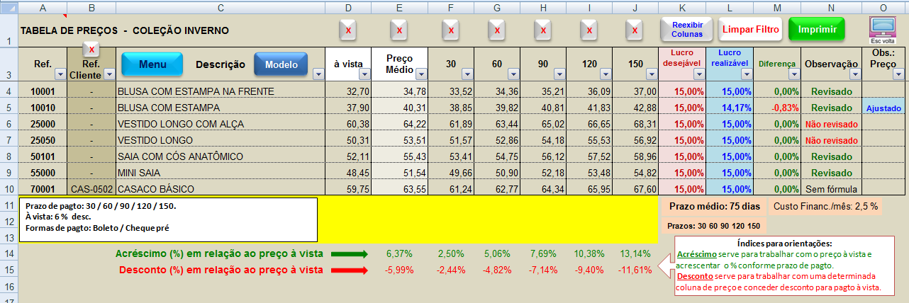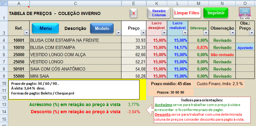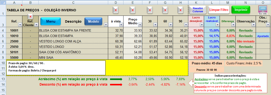 Abaixo da Tabela você tem duas linhas com índices para orientações de “acréscimo” ou “desconto”, em relação ao preço à vista baseado automaticamente no custo financeiro informado.