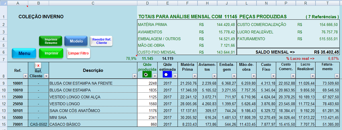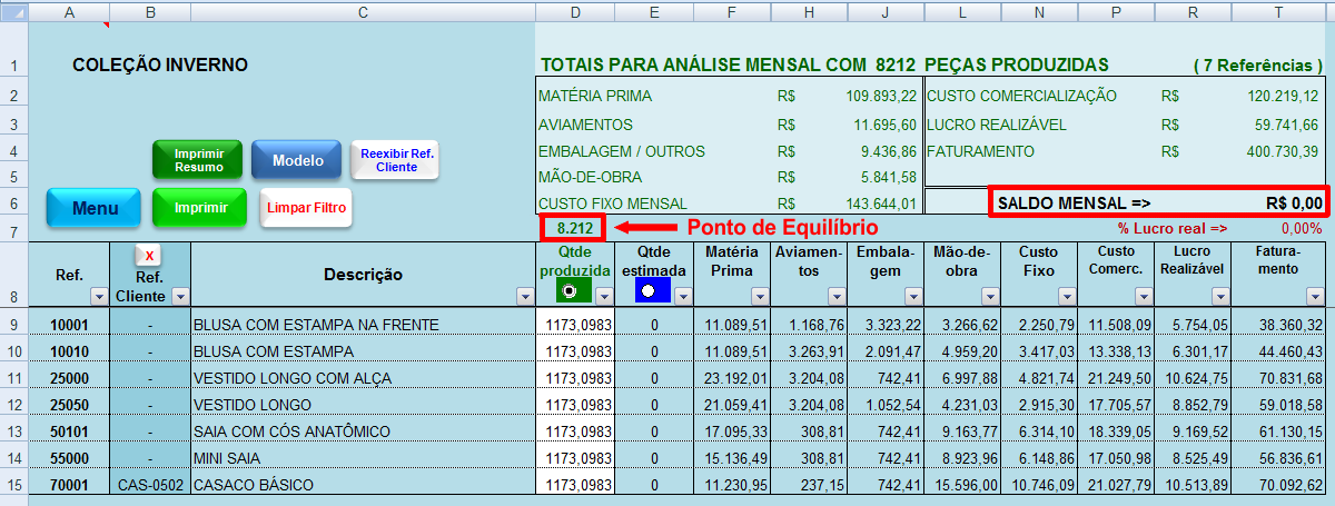 Neste exemplo abaixo mostra o Saldo Mensal (Margem de Contribuição) referente à produção do mês anterior, mostrando se a Confecção teve lucro ou prejuízo. Basta informar por Referência na coluna "D", a quantidade de peças produzidas no mês anterior.