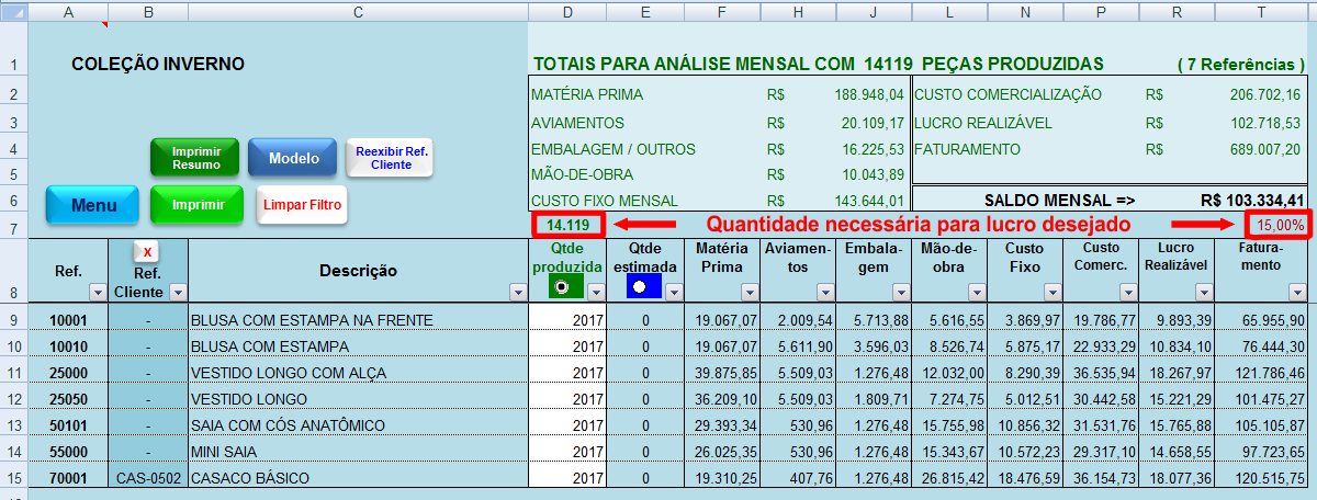 Conforme exemplo abaixo foi calculado a quantidade de 14.119 pçs/mês para atingir o Lucro Desejado (informado no Custo Comercial), que neste exemplo é de 15,00%.